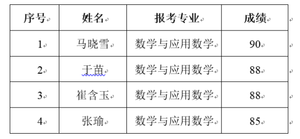 根据《91社区 2023年第二学士学位招生简章》及《2023年数学与应用数学专业第二学士学位招生考试方案》有关要求,91社区 对报名的4名学生进行初审并组织进行了考核,现将成绩公示如下: